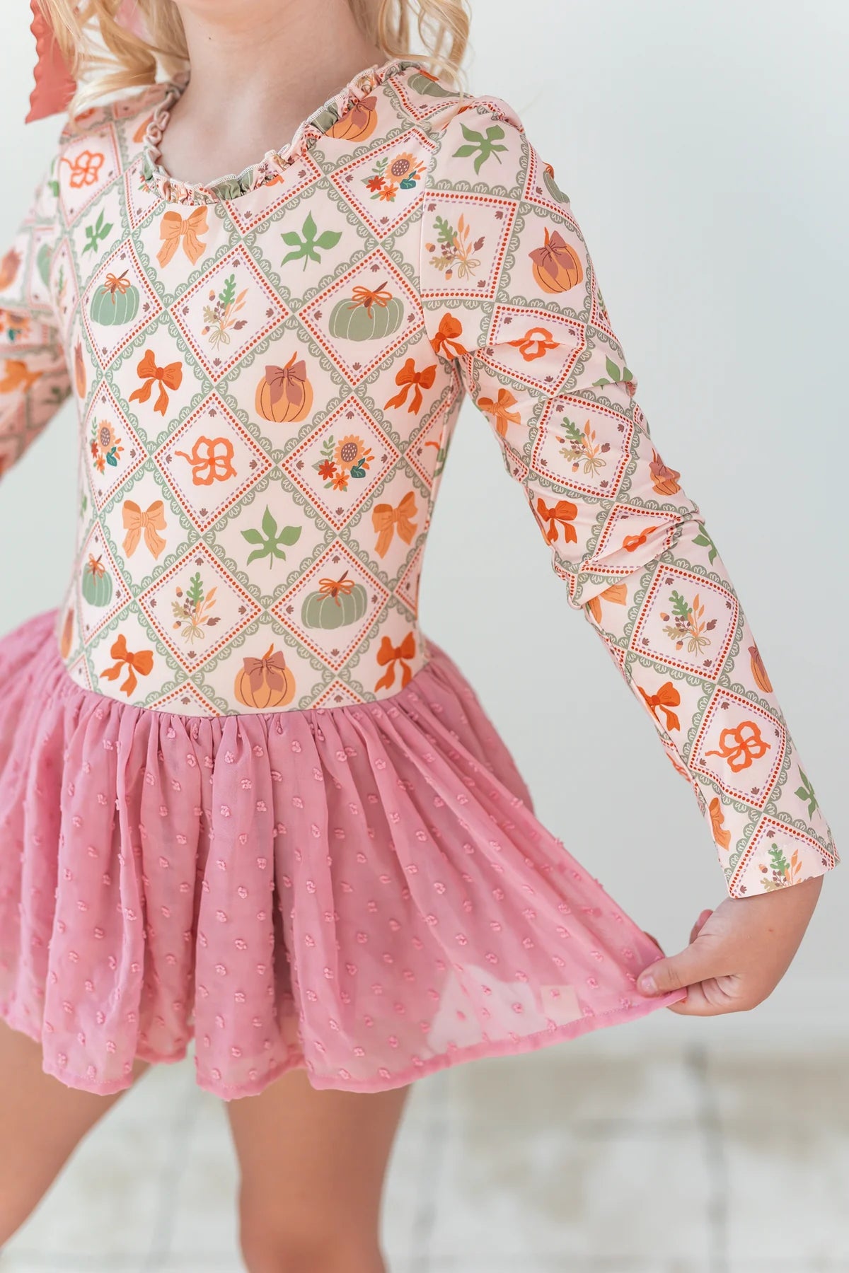 Get ready for fall with the Farrah Clipdot Leotard in Heirloom Harvest! Covered in a charming pumpkin bow and colorful autumn leaves, this playful print captures the spirit of the season perfectly. It’s the perfect fit for your little one’s dance adventures, adding a fun touch of fall magic to every move.