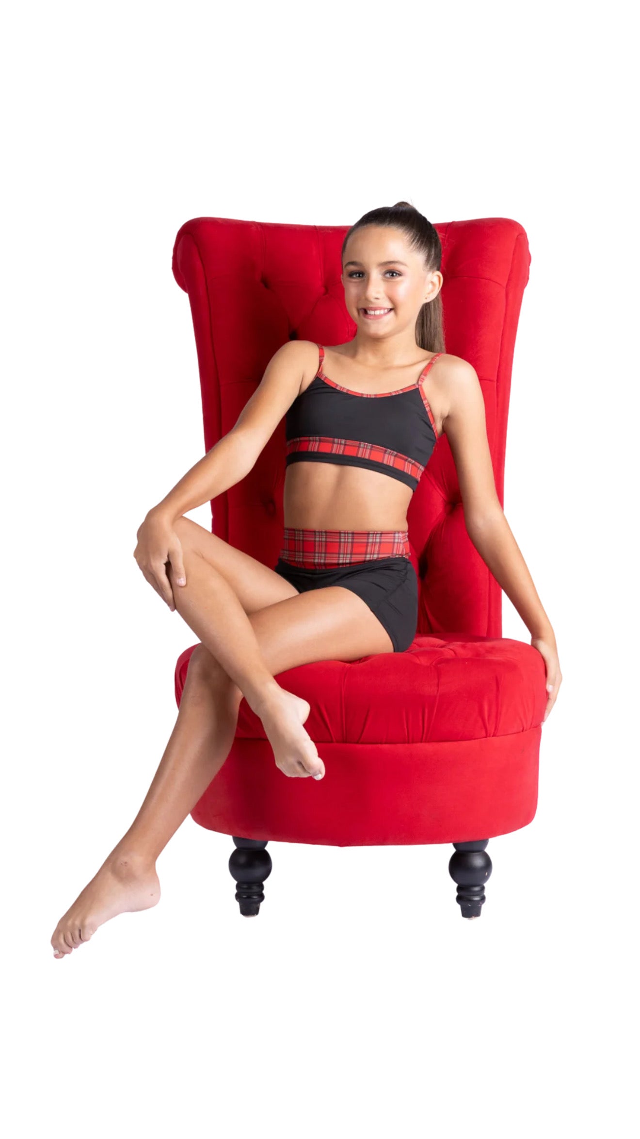 Classic meets festive! The Holiday Plaid Top features black fabric with tartan plaid accent strips.